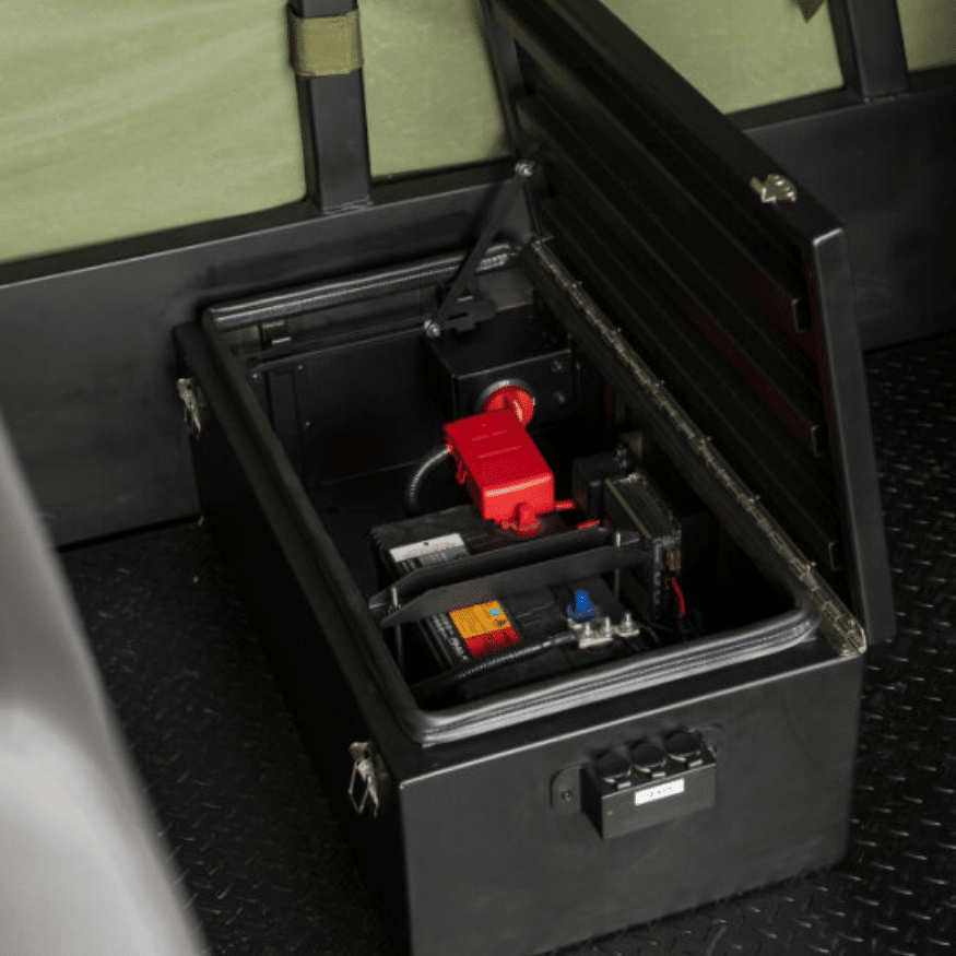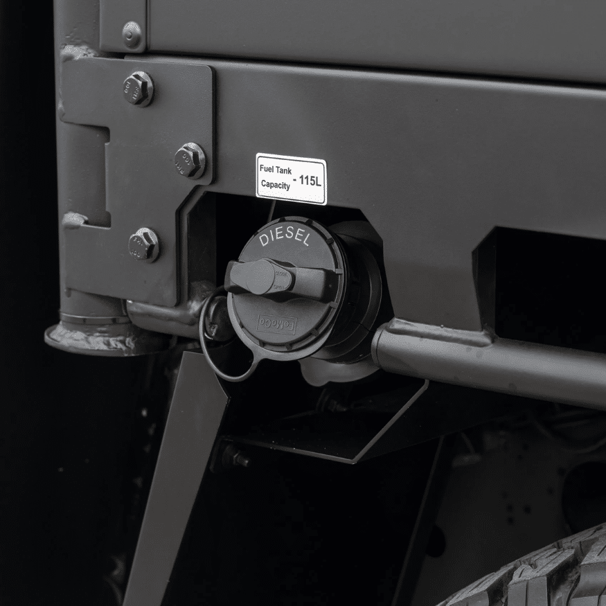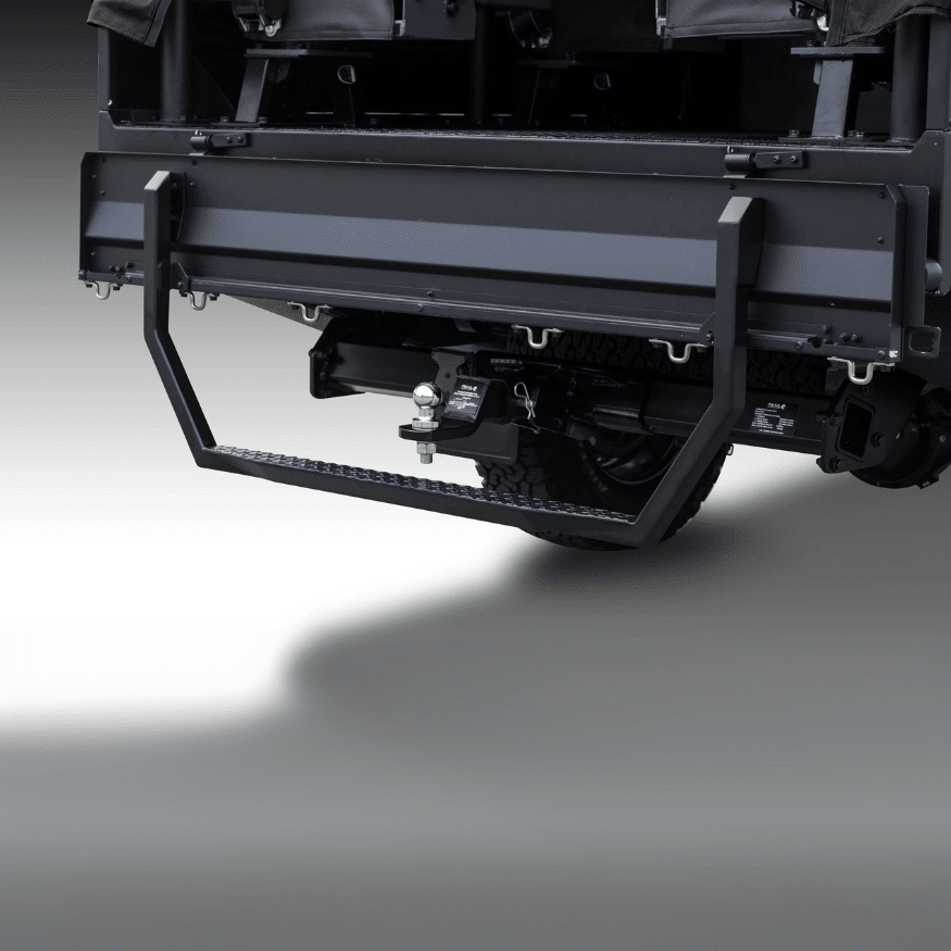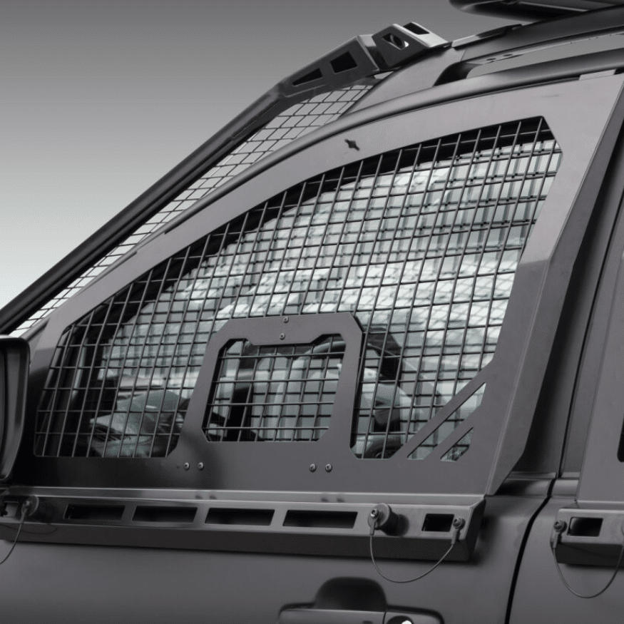 Offers a wide range of specialized equipment options, including a front bull bar with an electric winch, UHF and VHF antennas, and protective gear like mesh window guards and skid plates.Â