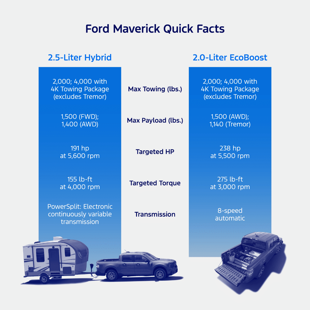 The 2025 Maverick® hauls up to 1,500 lbs of payload and, with the optional 4K Tow Package, tows up to 4,000 lbs—complete with Class III hitch, brake controller, and upgraded cooling. Pro Trailer Hitch Assist and Pro Trailer Backup Assist utilize cameras and sensors to make hitching and reversing effortless.